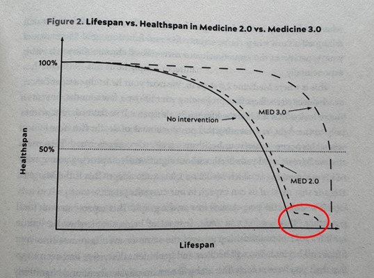 In onderstaande grafiek zie je hoe we in het Westen afwachten totdat men ziek wordt, terwijl de ‘healthspan’, de gezondheid, al enorm achteruit is gegaan. Een voorbeeld vanuit het huidige ‘Medicine 2.0’: iemand krijgt een hartaanval, wordt daarna gedotterd en heeft nog een paar jaar in relatief slechte gezondheid te leven (rode cirkel in onderstaande grafiek). Tot het moment van de hartaanval wordt er vanuit de gezondheidszorg eigenlijk niks gedaan om de gezondheid te optimaliseren en te voorkomen dat iemand een hartaanval krijgt.